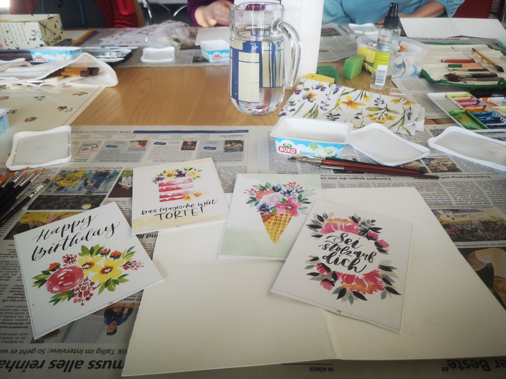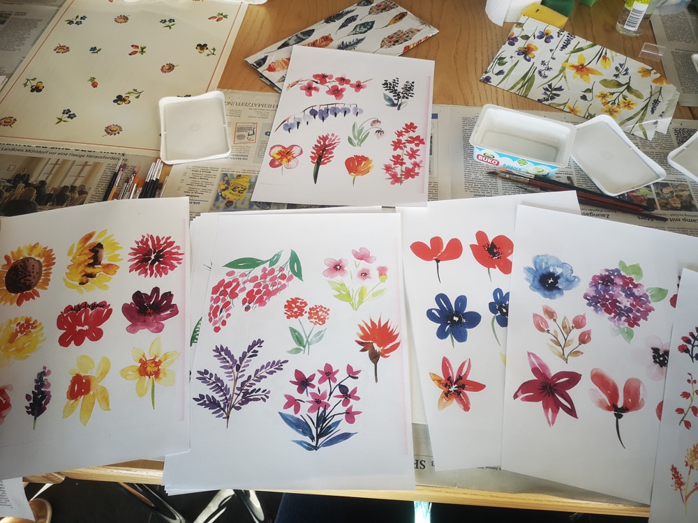 Es entstanden individuelle Motive mit tollen Farben und Stimmung für den Frühling. Mit Kaffee, verschiedenen Getränken und Krapfen umrahmt, genossen wir den Nachmittag und empfanden ihn als Entspannung im Alltag.