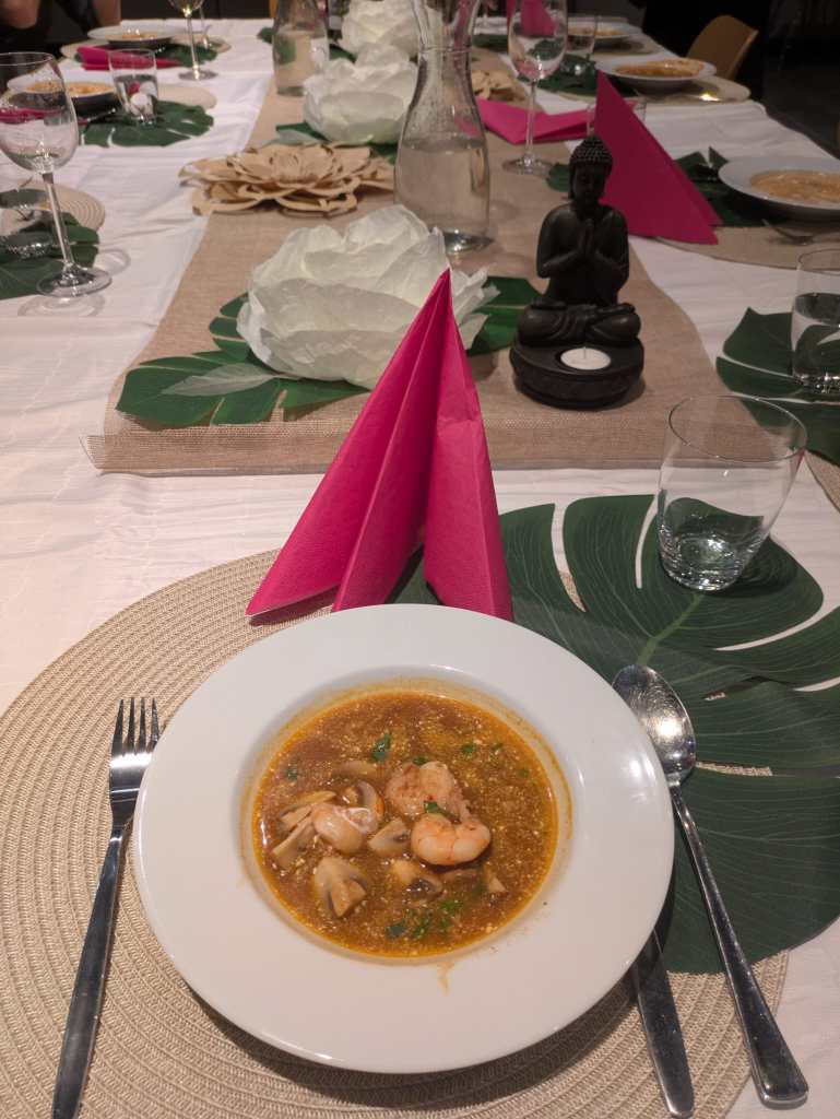 Gemeinsam wurde geschnippelt, gebrutzelt und auch viel gelacht. So füllte der Duft von frischen Kräutern, Kokosmilch und Curry bald den ganzen Raum. Mit großer Freude kochten die Teilnehmerinnen unter Anleitung von Michaela Zettl köstliche Gerichte wie Woknudeln, gelbes Curry und scharfe Garnelensuppe. Es wurde immer wieder probiert und gewürzt und bei einem Glas Wein viel gelacht. An der liebevoll und wunderschön gedeckten Tafel nahmen die Teilnehmerinnen bei fröhlicher Unterhaltung die Köstlichkeiten zu sich. Der fröhliche und genussvolle Abend ging dann unerwartet bis nach Mitternacht.