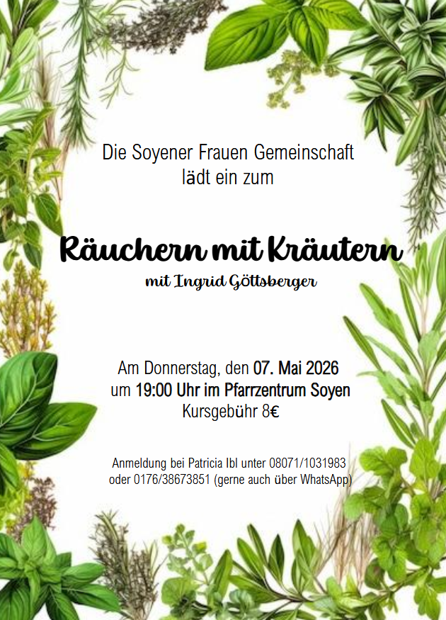 Vortrag Räuchern mit Kräutern Verfasst von soyenerfrauengemeinschaftweb am 26. April 202626. April 2026 Teilen mit: Auf X teilen (Wird in neuem Fenster geöffnet) X Auf Facebook teilen (Wird in neuem Fenster geöffnet) Facebook Gefällt mir Wird geladen … Ähnliche Beiträge